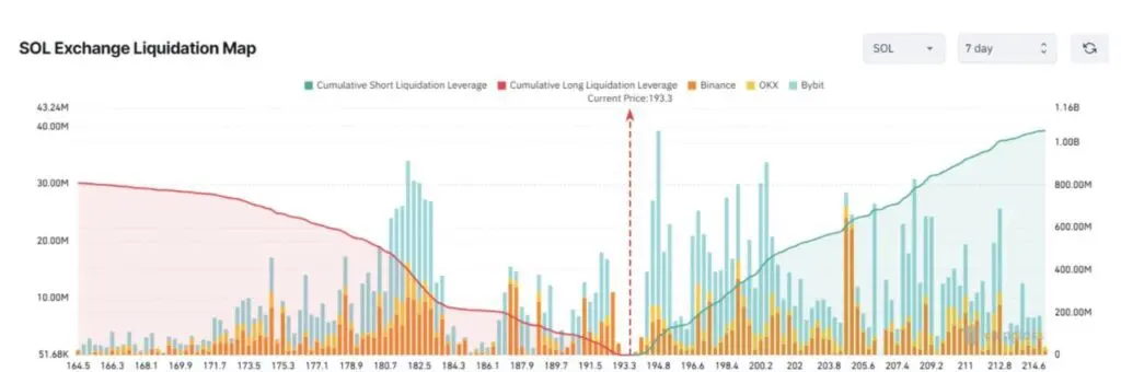 تظهر أحدث التقارير أن مستثمري سولانا أرسلوا ما مجموعه 688,000 SOL - بقيمة تزيد عن $132 مليون - إلى بورصات العملات المشفرة الأسبوع الماضي. كما تعكس خريطة التصفية في الأيام السبعة الماضية المشاعر السلبية، حيث تتراوح مستويات تصفية الشورت من $193 إلى أكثر من 200 دولار.