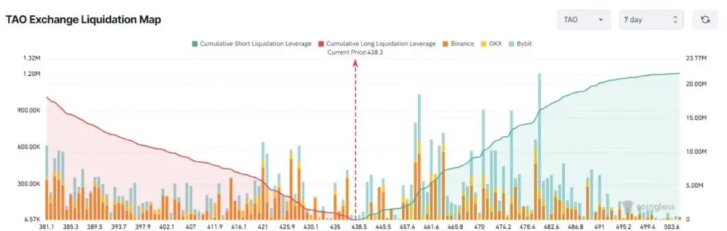 قد تكون هذه التطورات أخبارًا سيئة للمتداولين الذين يقومون بالبيع على المكشوف. إذا ارتفع سعر TAO إلى $500 هذا الأسبوع، فقد تتكبد المراكز القصيرة خسائر تزيد عن $20 مليون. وعلى العكس، إذا انخفض TAO إلى 381 دولارًا، ستواجه المراكز الطويلة إمكانية تصفية بقيمة $18 مليون.