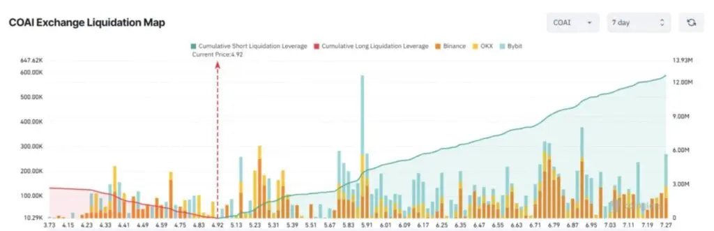 تظهر البيانات أنه إذا تمكن COAI من التعافي والارتفاع فوق $7 هذا الأسبوع، فقد يتم تصفية حوالي 11.5 مليون دولار من المراكز القصيرة. على العكس من ذلك، إذا انخفض السعر إلى 3.73 دولار، فإن حوالي 2.7 مليون دولار من المراكز الطويلة معرضة لخطر التصفية.