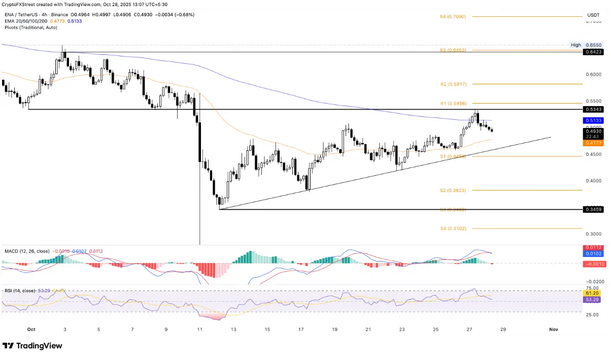 Ethena (ENA) sigue la tendencia de corrección después de ser rechazada en la zona de resistencia 0,5343 USD — un área que fue un soporte importante a principios de octubre. En el momento de escribir este artículo, ENA se negocia por debajo del umbral psicológico 0,50 USD y se acerca a la línea de soporte a corto plazo formada por el patrón de doble fondo (12/10 y 23/10), que está justo por encima de la zona 0,4600 USD.