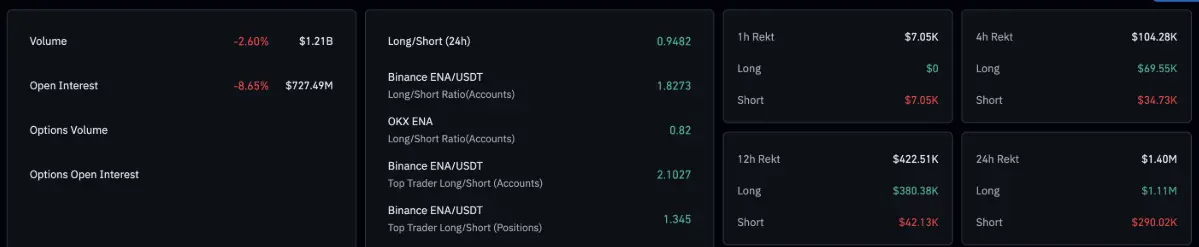 No solo se ha debilitado en la cadena, sino que también hay una atmósfera de cautela que envuelve al grupo de inversores minoristas. Los datos de CoinGlass registran que el contrato abierto (OI) del contrato de futuros ENA —una medida del valor nominal total de todas las posiciones abiertas— ha caído un 8,65% en las últimas 24 horas, a 727,49 millones de USD. Esto indica que los traders de derivados están reduciendo gradualmente su nivel de exposición al riesgo, reflejando una creciente cautela hacia Ethena a corto plazo.