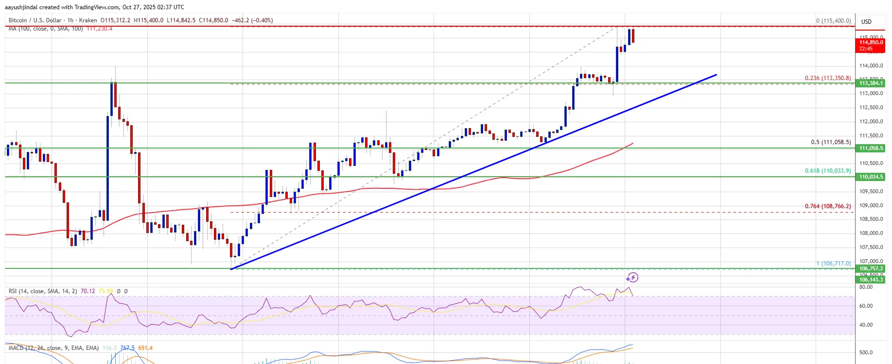 Los toros pudieron elevar el precio por encima de $113,500 y la media móvil simple de 100 horas. Finalmente, el precio aumentó por encima de $115,000 y actualmente está consolidando ganancias por encima del nivel de retroceso de Fibonacci del 23.6% de la reciente ola desde el mínimo de oscilación de $106,718 hasta el máximo de $115,400.