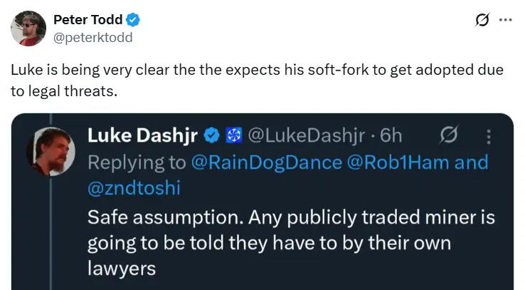 El criptógrafo canadiense y científico de la computación Peter Todd también intervino con una captura de pantalla de Dashjr y dijo que es “claro que espera que su soft-fork sea adoptado debido a amenazas legales.” Fuente: Peter Todd