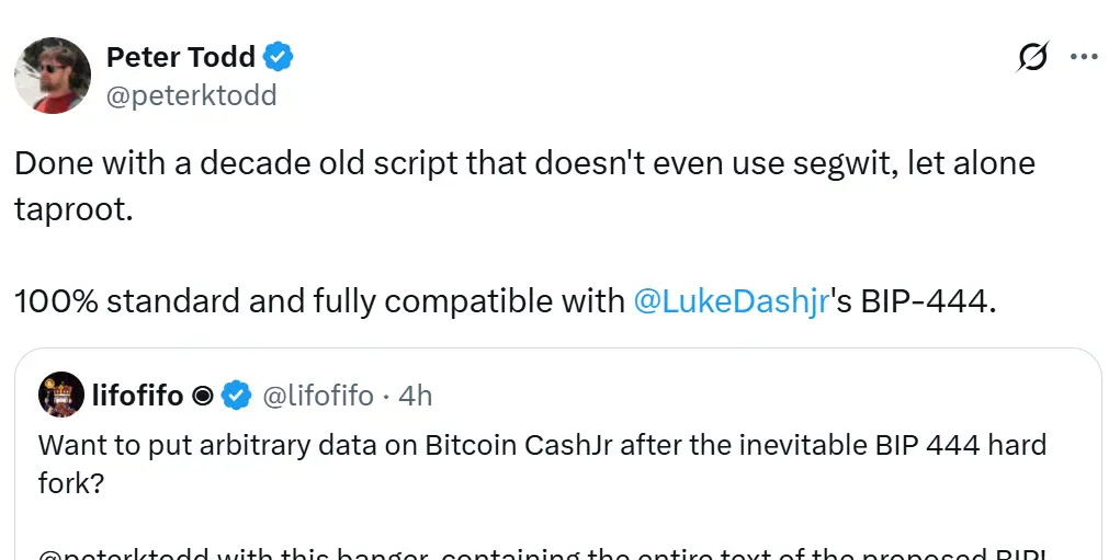 Sin embargo, Todd puede que ya haya encontrado una forma de explotar la solución en la propuesta. Afirma haber registrado una transacción que contiene el texto completo de la bifurcación propuesta que es “100% estándar y totalmente compatible” con la propuesta de mejora.