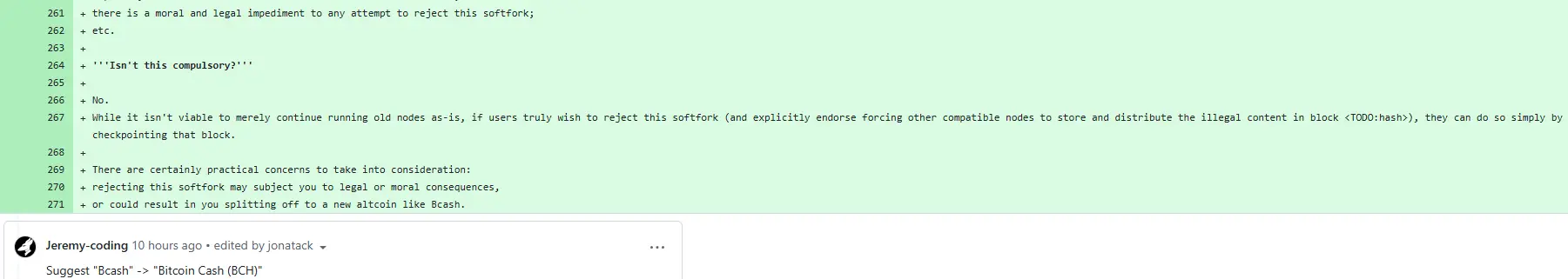 Sin embargo, bajo la propuesta de mejora, los desarrolladores han escrito en la línea 261 que “hay un impedimento moral y legal para cualquier intento de rechazar este soft fork.”