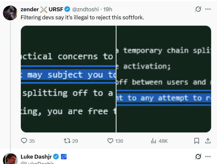Una nueva propuesta de mejora de Bitcoin para un soft fork, creada por el desarrollador principal Luke Dashjr, ha provocado indignación en X debido a una sección que algunos afirman está amenazando con consecuencias legales para quienes rechacen el fork.