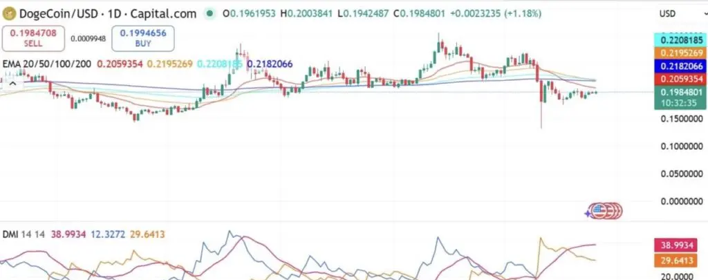 Según un informe de un medio de noticias de criptomonedas, Dogecoin sigue atascado en una fase de consolidación mientras la batalla entre los compradores (toros) y los vendedores (osos) continúa por el control del mercado. Aunque los datos en cadena muestran acumulación, el movimiento del precio de DOGE todavía está luchando por superar niveles de resistencia importantes a corto plazo. Actualmente, el DOGE se está negociando por debajo de las líneas EMA de 20, 50, 100 y 200, señalando una fuerte presión bajista. El índice de movimiento direccional (DMI) también refuerza esta señal, con el índice positivo alrededor de 12 y el índice negativo cerca de 39.