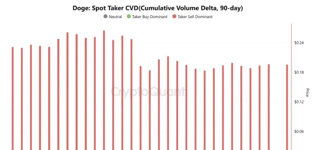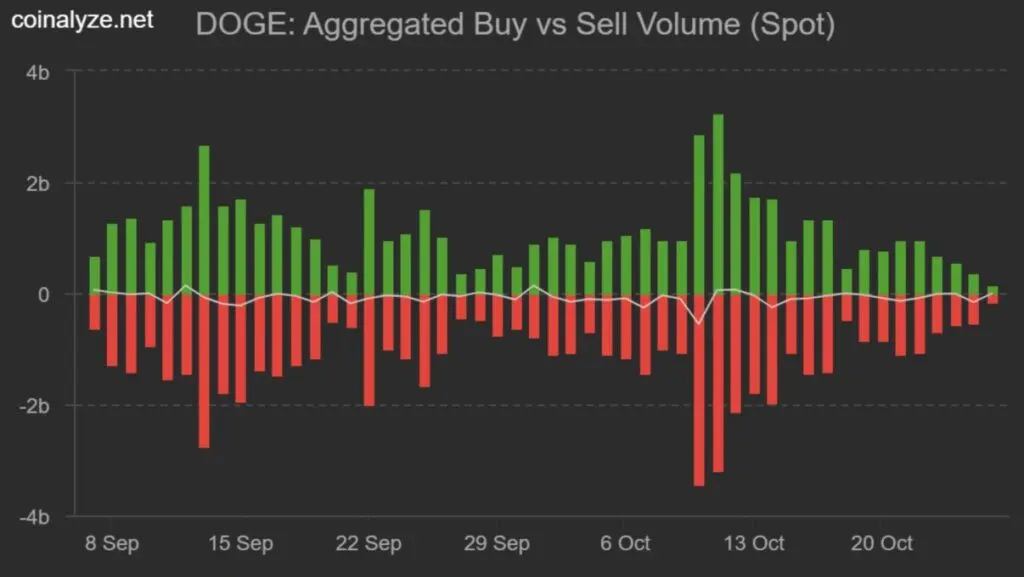 Mientras que las ballenas parecen estar acumulando Dogecoin, los traders minoristas exhiben el comportamiento opuesto: continúan vendiendo. Los datos históricos muestran que un regreso a la actividad de las ballenas a menudo coincide con una disminución en la participación de los traders minoristas. Según el análisis de una plataforma de análisis de criptomonedas, el indicador Spot Taker CVD se mantuvo en territorio negativo durante todo el mes de octubre, señalando la continua dominación de los Vendedores. Esto refleja una presión de venta agresiva por parte de los traders de spot.
