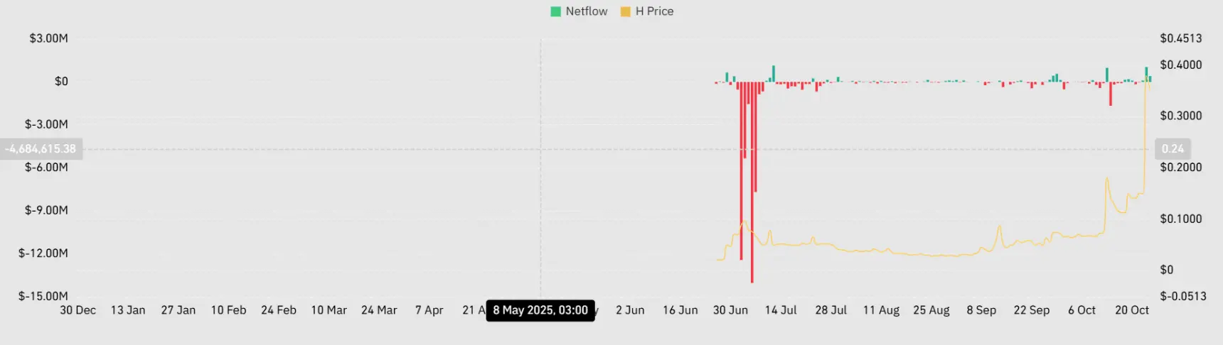 Source : TradingViewAvec ces signaux, H a de fortes chances de continuer à élargir sa tendance haussière, voire de tester à nouveau le sommet historique et de s'approcher du seuil de 0,4 USD si le camp des taureaux maintient son avantage. Cependant, dans le scénario inverse – lorsque la demande faiblit et que la pression de prise de bénéfices augmente – le token pourrait se corriger vers la zone de 0,30 USD, avec le seuil de 0,20 USD servant de zone de support clé.