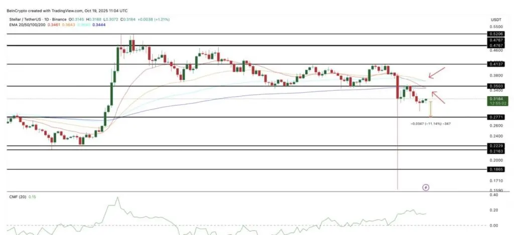 Saat ini, XLM diperdagangkan sekitar $0,31 dan terus mencatat aliran masuk dari whale investor. Indikator Chaikin Money Flow (CMF) – yang mengukur aliran dana masuk atau keluar dari suatu aset – telah tetap di atas nol sejak 7 Oktober. Ini menunjukkan bahwa investor besar masih menambah posisi meskipun ada tekanan pasar.