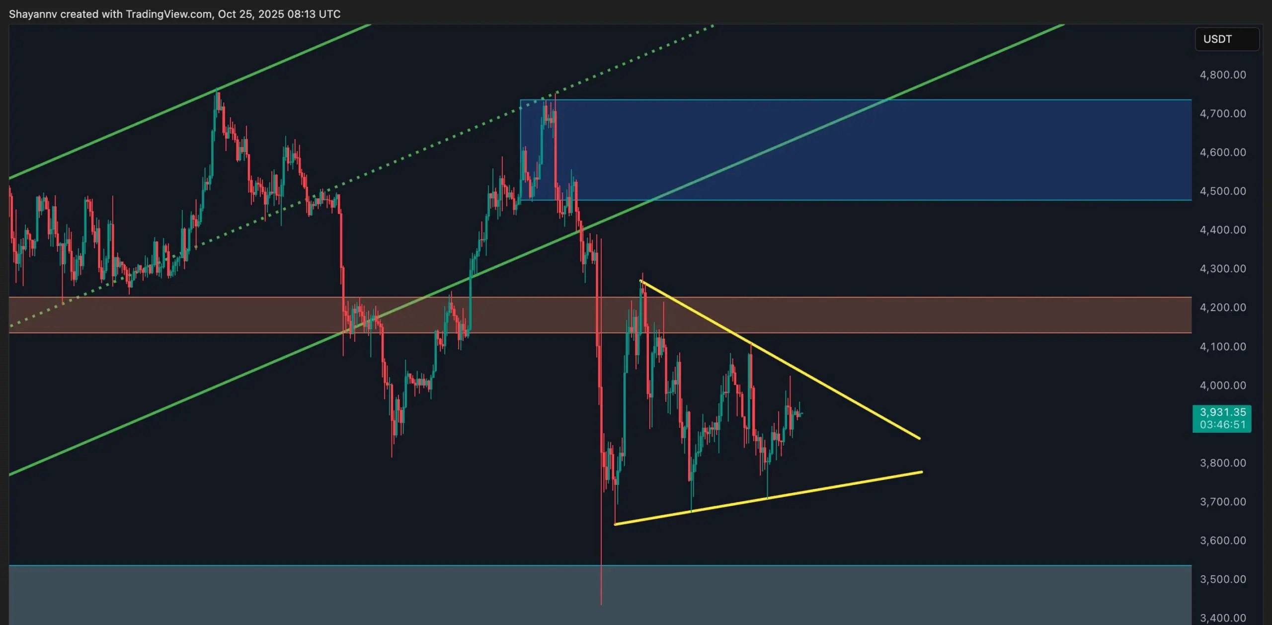 Pola kompresi ini menandakan fase penumpukan likuiditas, di mana trader memposisikan diri menjelang kemungkinan ekspansi volatilitas. Jika bull berhasil mendorong di atas garis tren atas, rally menuju $4,1K dan mungkin $4,6K bisa terjadi. Sebaliknya, penurunan di bawah $3,7K akan mengekspos zona permintaan $3,4K sekali lagi. Hingga ada konfirmasi, Ethereum kemungkinan akan terus berosilasi dalam rentang yang menyempit ini — sebuah pengaturan yang biasanya mendahului breakout arah yang tajam.