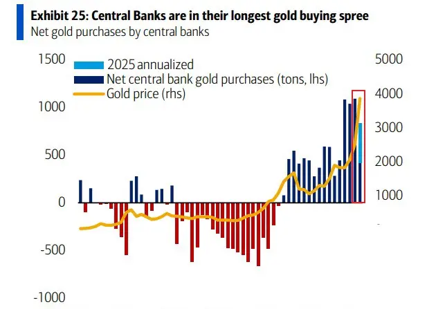 Grafik dari bank investasi global menunjukkan bahwa sebelum tahun 2010, bank sentral adalah penjual bersih emas selama lebih dari dua dekade. Sejak itu, pembalikan telah sangat dramatis, dengan pembelian emas sekarang mempertahankan rekor pembelian terlama.