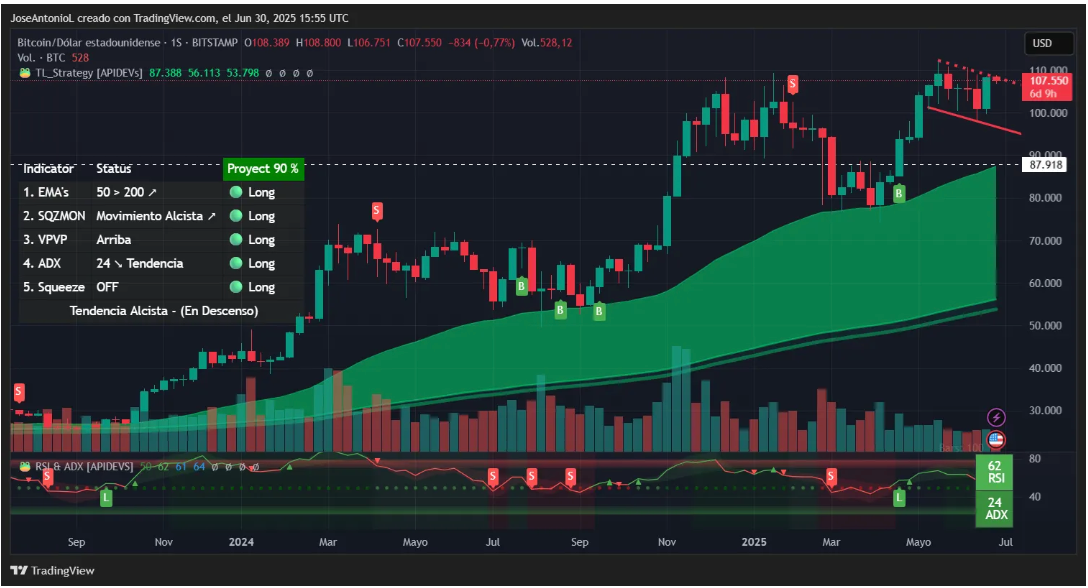 スクイーズモメンタム指標が「クローズ」状態を示しており、ボラティリティが最近のスクイーズ段階から解放されたことを示しています。これは通常、大幅な変動の後に発生し、市場が上昇を消化し、次の上昇に備えていることを示しています。