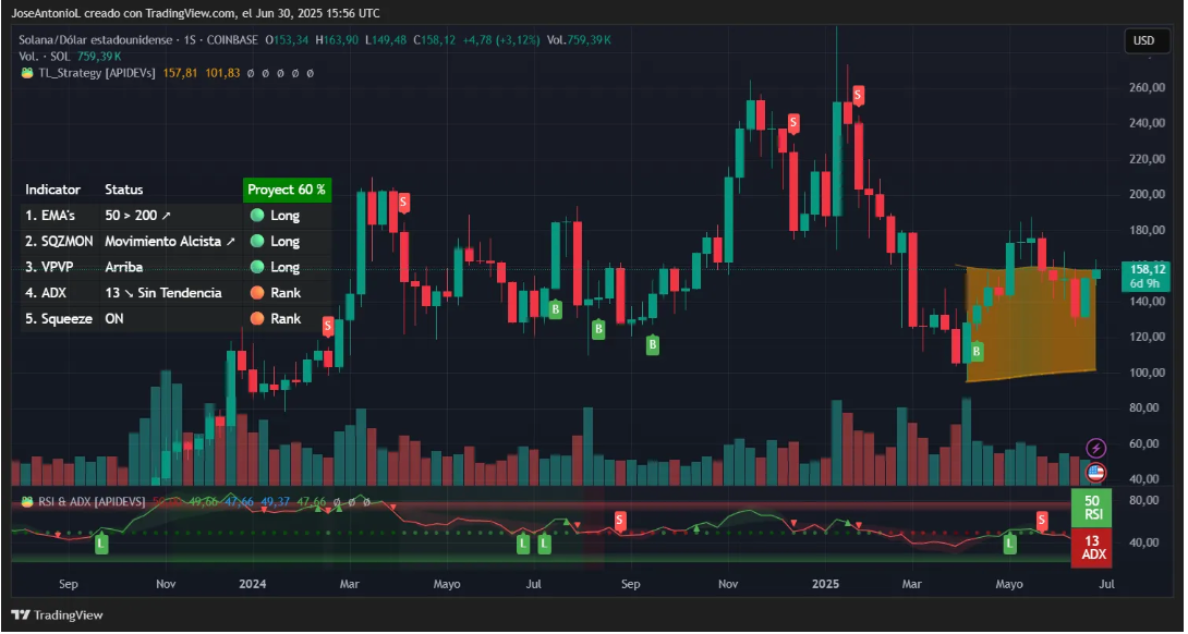 週足チャートを見ると、Solana は三大暗号資産の中で最も楽観的なテクニカル面を呈しており、動きは若干異なるものの、現在のSolanaの取引価格は158.12ドルで、50週移動平均線(約150ドル)を上回る位置を果敢に取り戻すことが期待されています。さらに重要なことに、200週移動平均線は現在100ドル前後に位置しています。この価格が2つの週移動平均線を上回る構成は、強気な市場構造を示しており、通常はポジションを持つ買い手を惹きつけます。