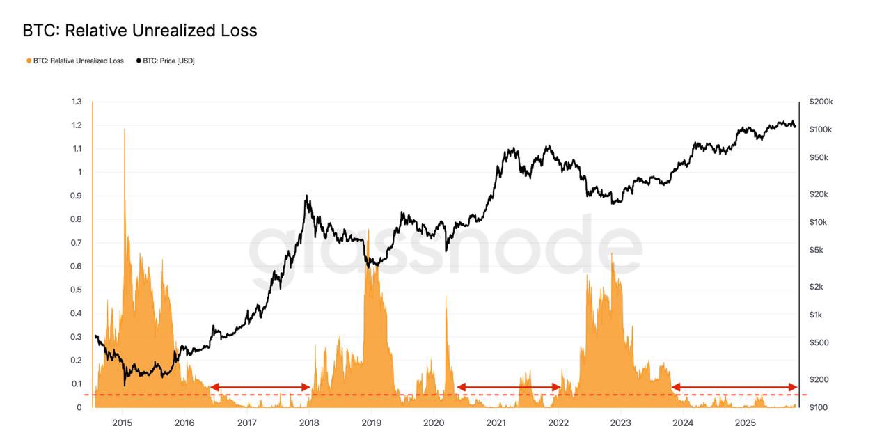 ある分析プラットフォームによると、ビットコインの相対未実現損失 (RUL)は、水中に保有されている通貨のUSD損失を市場資本で正規化して測定したもので、5%未満にとどまっており、これは歴史的に健全なブルマーケットと関連付けられるレベルです。