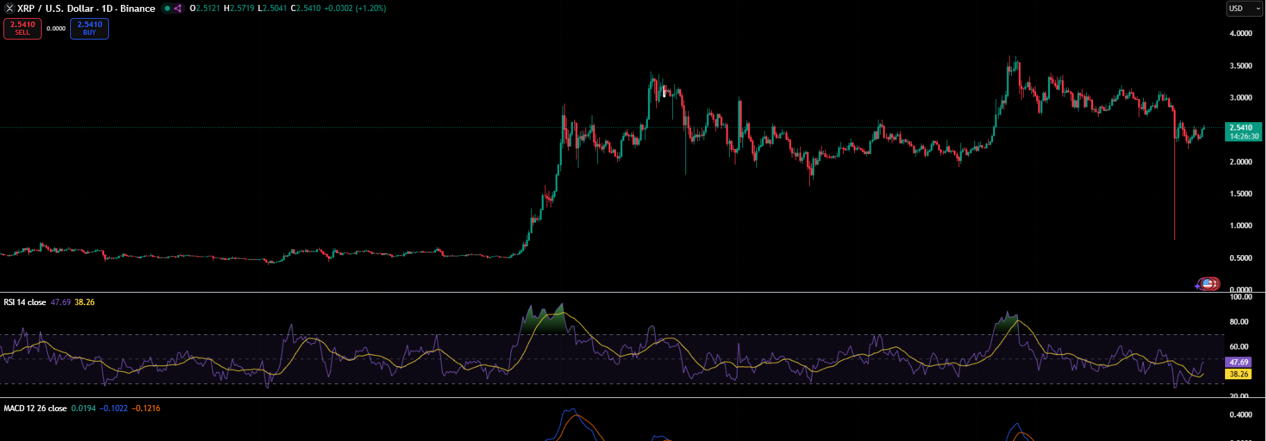 テクニカル指標は慎重な楽観を反映しています。XRPのRSIは47近くにあり、中立的なモメンタムを示唆しています。一方、MACDヒストグラムはポジティブクロスオーバーの初期兆候を示しています。これらのシグナルは、取引量の増加と相まって、トレーダーが潜在的な上昇継続に向けて徐々にポジショニングを取っていることを示しています。