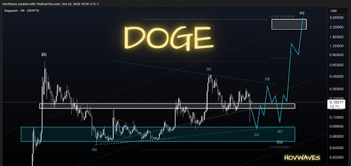 暗号アナリストは、最近の暗号市場の崩壊にもかかわらず、ドージコイン価格のマクロターゲットは変更されていないと述べた。これは、DOGEが心理的な$0.2レベルを取り戻そうとしている中で起こり、ミームコインにとって大幅な反発を引き起こす可能性がある。ドージコイン価格のマクロターゲットは$2の上に留まっています----------------------------------------------------SNSの投稿で、暗号アナリストはドージコインの価格に対する同じマクロターゲットを持っていると述べました。彼の付随するチャートは、DOGEが来年までに$3 まで急騰する可能性があることを示しており、これはアルトコインにとって新たな史上最高値(ATH)を記録することになります。しかし、ミームコインが年末まで横ばいで取引され続ける可能性もあります。その間、アナリストはドージコインの価格動向が予想通りに進展したことを指摘し、DOGEは安値から反発し、50%以上下落したと述べました。彼はこの動きが下のサポートレベルには達しなかったが、これまでのところ、安値からの反発はかなり修正的に見えると付け加えました。このミームコインは先月約$0.30の高値から急落し、トランプが中国に対して100%の関税を発表した後の急落の中で最近$0.11に触れました。アナリストはまた、ドージコインの価格動向が次の週にどのように展開するかに焦点を当て、C波の修正動きが入るかどうかを見守ると述べました。現在、DOGEは反発し、心理的な0.2ドルの水準を取り戻そうとしています。これは、米国と中国の間での潜在的な貿易協定に関する楽観論によって引き起こされました。ホワイトハウスは、米国のドナルド・トランプ大統領が10月30日にAPECサミットで中国の習近平国家主席と会談することを確認しました。一方、昨日発表された9月のCPIは予想を下回り、これもドージコインの価格の反発に寄与しました。DOGEの第3のブルウェーブが地平線に迫る-----------------------------------別の暗号アナリストがソーシャルメディアの投稿で、ドージコイン価格のための第3のブル波が近づいていることを明らかにしました。彼は、DOGEが2017年と2021年に2回の大きなブル波を経験したことを指摘し、現在別のブル波が準備中であると述べました。アナリストは、別のブル波を示す現在の価格動向を分析しました。アナリストは、長期的な下落トレンドが破られ、リテストが完了したことを明らかにしました。さらに、彼は高い時間枠の25MAがサポートに戻っていると述べました。一方、ドージコインの価格は、数年間の上昇チャネルの下部バンドで力を蓄えていると言われています。アナリストは、すべてのテクニカル指標が新しいサイクルの始まりを「ささやいている」と付け加えました。そのため、彼は3回目のブルウェーブがいつ起こるかの問題であり、起こるかどうかの問題ではないと信じています。執筆時点で、ドージコインの価格は約$0.19で取引されており、過去24時間で上昇しています。市場追跡プラットフォームのデータによると。