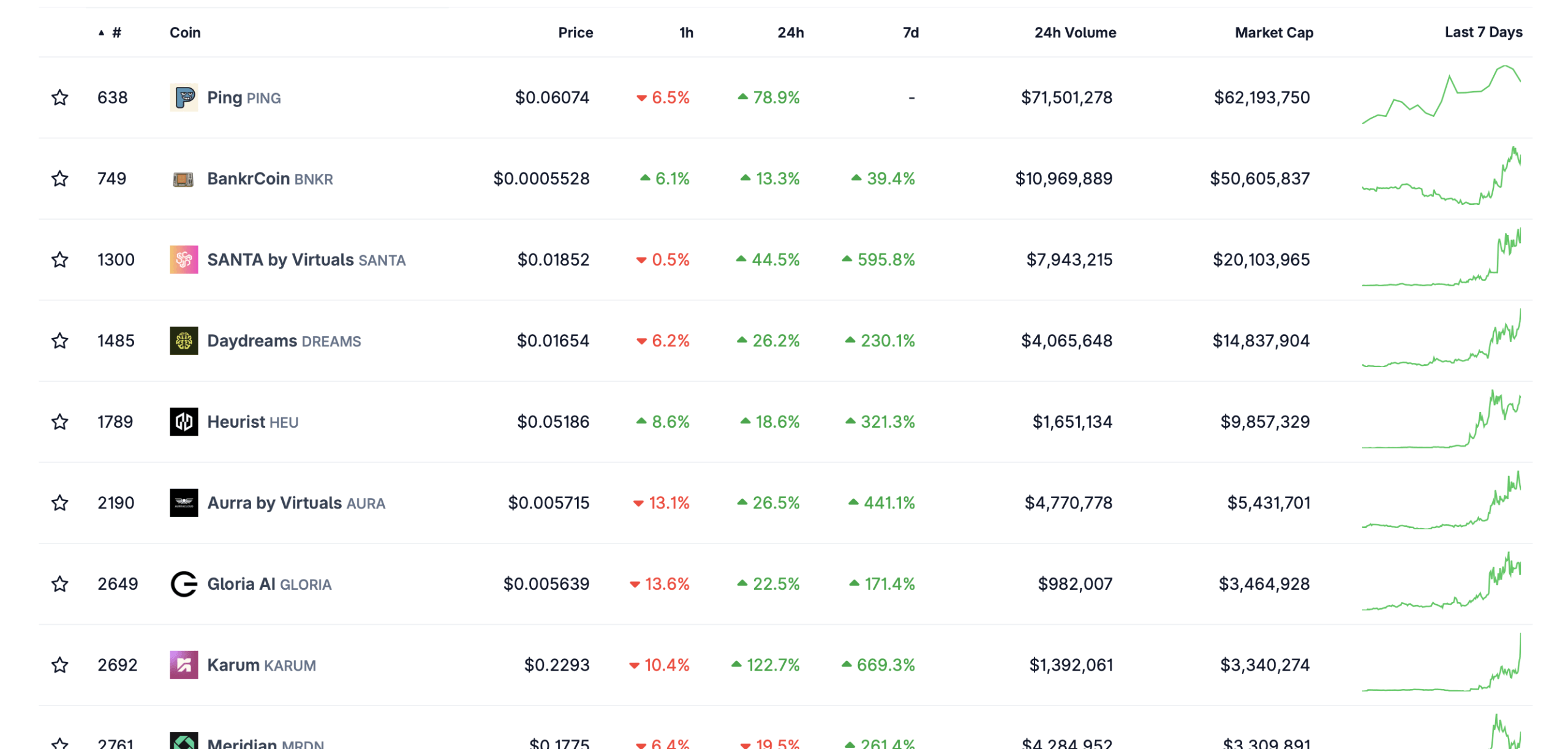 例えば、PING—Ping Observerによって作成された—は、x402を通じて直接鋳造された最初のトークンであり、AIエージェントの監視のための支払いを可能にします。HEUはHeurist AIから提供され、ユーザーはデータクエリごとにUSDCで支払うことができ、ステーキング報酬を提供します。SANTAはVirtualsによって提供され、クロスチェーンタスクとエアドロップを実行するAIの「エルフ」のネットワークに燃料を供給します。