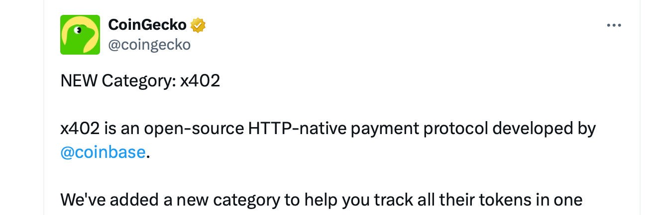 コインゲッコーが$178M x402トークンカテゴリを追加、AIマイクロペイメントが加熱中