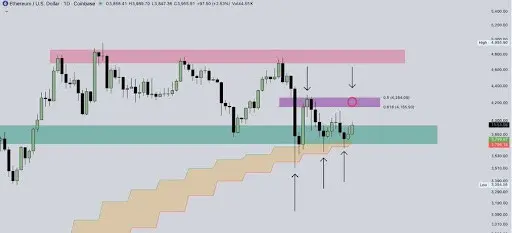 彼は、ETHがブレイクアウト後に「ゴールデンポケット」ゾーンを上回る限り、最も可能性の高い結果はさらなる上昇であると付け加えました。この重要な領域でのモメンタムを維持することは、強気のシナリオを強化し、イーサリアムが大きな修正に直面することなく、より高いレジスタンスレベルに向かって上昇を続ける可能性があることを示唆しています。