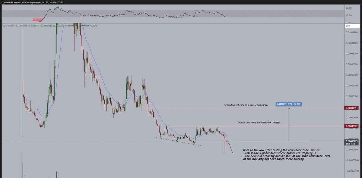 彼はまた、SEIを彼のトップポートフォリオの選択肢の一つとして強調し、トークンが現在強いサポートを再テストしており、今後2ヶ月から4ヶ月の間にビットコインに対して3倍または4倍になる可能性があると指摘しました。