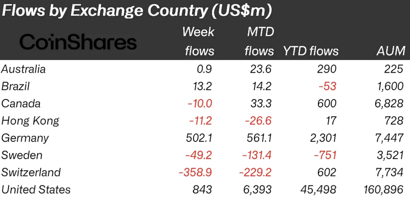 最近の報告によると、米国は$843 百万の流入で圧倒的な地位を占め、ドイツも$502 百万という強力な数字を記録し、これは同国の記録の中でも最大のものの一つです。それに対して、スイスは$359 百万の流出を見ましたが、これは主に資産移転によるものであり、売却圧力によるものではありません。