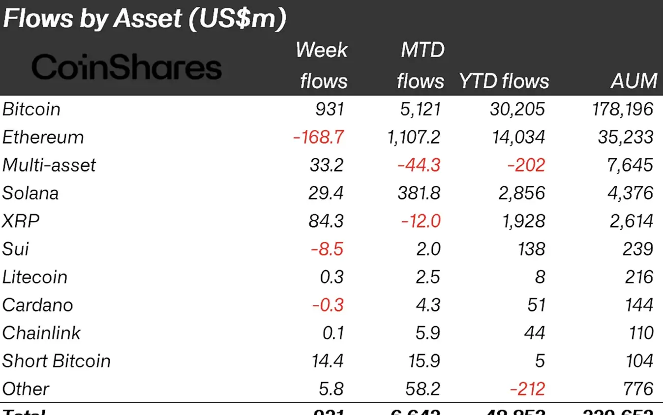 ビットコインは再び市場をリードし、$931 百万の流入を引き寄せ、金融緩和への期待の中でその支配力を強化しました。これにより、ビットコインの年初来(YTD)流入は302億ドルに達し、昨年の416億ドルにはまだ及ばないものの、金利引き下げの開始以来、機関投資家の新たな需要を示しています。