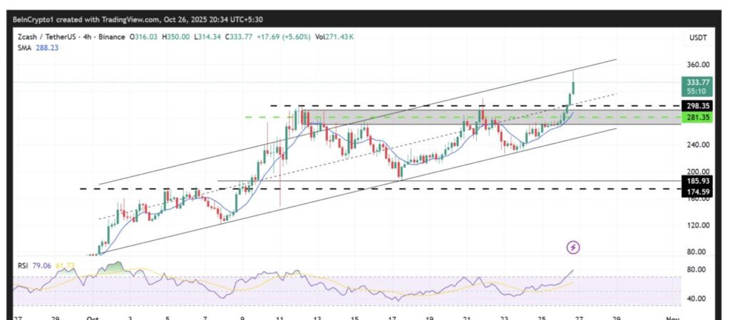 Zcashの価格(ZEC)は、過去3ヶ月で750%以上急騰し、トークン保有者は2025年10月26日の24時間で20%以上の利益を得ました。この休眠していたプライバシーコインは、2016年のローンチ以来ほぼ9年間の相対的な静けさの後、10月から注目を集めています。# アーサー・ヘイズがZcashの価格ラリーを復活させる市場追跡プラットフォームのデータによると、Zcashの価格は20.8%上昇し、10月26日時点で332.52ドルで取引されていました。この増加は、主要な暗号デリバティブ取引所の共同創設者で元CEOのアーサー・ヘイズが、Zcashエコシステムの主要トークンであるZECの野心的な価格目標を10,000ドルに設定した後に起こりました。ヘイズは、逆循環的なマクロ経済観と市場を動かすコメントで知られており、ブラックフライデーの市場崩壊がZECの上昇を抑えることができなかったにもかかわらず、オルトコインへの関心を復活させました。「...長い沈黙の後、ZECは突然伝説的なシリコンバレーの投資家から支持を受け、多くの人々がそのトレンドに従い、1ヶ月にわたるFOMO (逃すことへの恐怖)現象を引き起こした」とアナリストのクアイ・ドンは言った。Zcashは、年々時折価格が急騰することがありましたが、規制が厳しくなり、開発者の活動が減少するにつれて、ほとんど忘れ去られていました。最近数週間で、ZECは再びトレーダーの注目を集めていますが、それは単なるノスタルジアの要因だけではありません。この文脈において、アナリストたちはZECの価格上昇を、Bitcoin (BTC)やEthereum (ETH)の初期の熱狂時代と比較しています。現在、いくつかの構造的要因が整い始めています。"ZECは本当に私を驚かせました。価格は3ヶ月で+755%上昇し、前の高値($305)で抵抗をテストしています。今月、主要な資産運用会社がZcashのための信託を立ち上げ、ZECは新しいデリバティブプラットフォームに上場し、近づく半減期、さらに「BTC対Zcash」の議論が爆発的な勢いを助長しています"と、暗号アナリストのレナート・スナイダーは述べました。同様に、Clifton FXのテクニカルアナリストは、ZECの8時間チャートにおいて上昇三角形パターンを強調し、ブレイクアウトが発生した場合に100-150%のさらなる上昇の可能性があることを示しています。# アナリストが注意を促す警告を発表しかし、このラリーに納得している人は全員ではありません。人気のDeFiアナリストであるIgnas DeFiは、Zcashがどのように物語が生まれ、バイラルになるかの完璧な例であると述べました。彼は、多くの投資家が単に「出口流動性」である可能性があると警告しています。イグナスはまた、トレーダーがソーシャルメディアでZECに関するコンテンツを見て、取り残されることを恐れて購入する反射ループ現象について説明しました。このFOMOは、より多くの人々がZEC関連のコンテンツと対話することでハイプを強化し、そのサイクルが繰り返されるのです。一方、Helius LabsのCEOであるMert Heliusは、ZECの評価について疑念を表明し、他の大型アルトコインと比較した場合、ZECの評価があまり合理的ではないと指摘しました。# Zcashの価格見通し: ZEC保有者は$281.35のレベルに注意すべき理由現在のZEC価格は$333.77で、市場の注目は$281.35の重要なサポートレベルにあります。これは$270.95と$292.22の間の供給ゾーンの中間閾値です。歴史的に、このエリアを価格がテストするたびに、価格が上昇するのを止める大きな売り圧力があります-少なくとも最新のブレイクアウトの前までは。技術的に見て、ZECの価格は現在、上昇する平行チャネルパターンで動いており、この形成内に価格が留まる限り、上昇の可能性はまだ開かれています。RSI (相対力指数)インジケーターが引き続き上昇しているため、上昇の勢いは依然として続いており、ZECの価格は$360を突破する可能性があり、これは現在の水準から約6%の増加を反映しています。しかし、チャネルの上限が強い抵抗エリアであることが証明される場合、ZECの価格は下落する可能性があります。価格が$298.35のチャネルの中心線を下回ると、調整が強まります。また、9日間単純移動平均(SMA)のサポートも破られる可能性があります。修正は、日足のローソク足が平均レベルの$281.35を下回って閉じた場合にのみ真に確認され、売り圧力が市場を支配していることを示します。そうなった場合、ZECの価格は$240 の範囲まで下落し、強気のテクニカルパターンから抜け出す可能性があります。最悪のシナリオでは、価格は$200の心理的レベルを下回ることさえあります。さらに、RSIの79の位置は、ZECがすでに買われ過ぎであることを示しており、買い手の疲れによる近い将来の可能な修正を示唆しています。