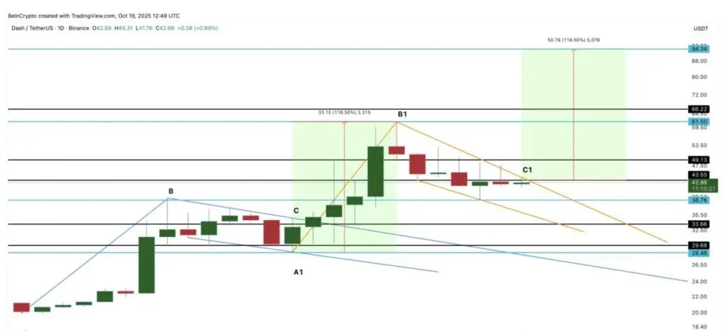 Nos últimos 30 dias, o preço do DASH subiu quase 83%, embora a recente realização de lucros tenha levado a uma correção de 24,8% na última semana. Curiosamente, no entanto, essa correção parece ser parte de um padrão de continuação maior, em vez de uma reversão total da tendência. Anteriormente, o token conseguiu romper um padrão de bandeira e poste (marcado em azul), que mirava um preço em torno de $66 e subiu brevemente para $61 antes de cair.