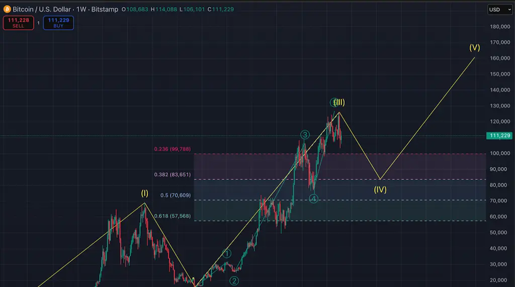 Um responsável de investimentos notou na sexta-feira que, de acordo com a sua análise da Teoria das Ondas de Elliott, a corrida de touros que começou em novembro de 2022 foi concluída. Ele suspeita de uma correção (Onda IV) — a ser concluída entre meados e finais de 2026 — resultando em BTC a cair para algum lugar entre $84,000 e $100,000. A partir daí, subiria, mostra o seu gráfico: