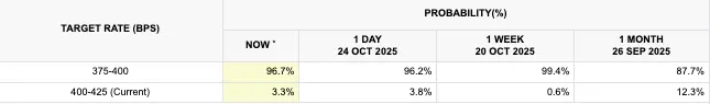 A ferramenta FedWatch do CME Group — utilizando os preços dos futuros de fundos federais a 30 dias — colocou a chance de um corte de taxa de juro de 25 pontos base esta semana em 96,7%, na manhã de segunda-feira. A chance de dois cortes de 25 pontos base até ao final do ano era de aproximadamente 94%.
