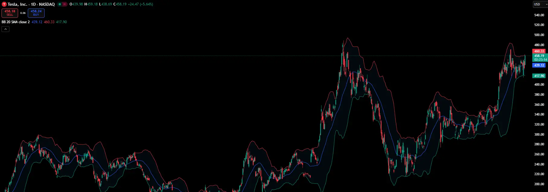 На момент написания, TSLA торгуется около $458 после роста более чем на 5% за день. Акции преодолели основные уровни сопротивления, и индикаторы моментума рисуют бычью картину. На дневном графике Индекс относительной силы (RSI) колеблется около 60 – значительно ниже зоны перекупленности – в то время как линия MACD пересекла сигнальную линию, что указывает на возобновление восходящей силы.
