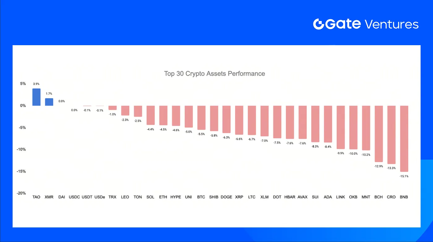The top 30 crypto assets dropped by an average of 7.5% last week, with only Bittensor (TAO) and Monero (XMR) posting modest gains.
