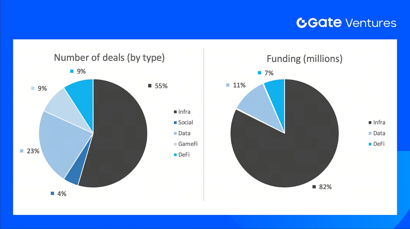 The number of deals closed in the previous week was 22, with Infra having 12 deals, representing 55% for each sector of the total number of deals. Meanwhile, Data had 5 (23%), Social had 1 (5%), Gamefi had 2 (9%) and DeFi had 2 (9%) deals.