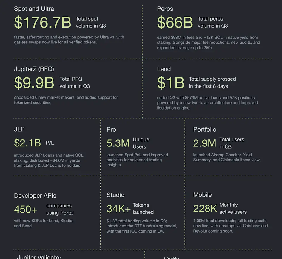 Ngoài bộ tổng hợp giao dịch chính, đội ngũ còn vận hành các sản phẩm như perps, một nền tảng ra mắt memecoin, bể thanh khoản JLP, cho vay, staking thanh khoản, công cụ theo dõi danh mục đầu tư, một địa điểm RFQ (JupiterZ), API cho nhà phát triển, hệ thống xác minh token (Verify) và nút xác thực Solana lớn thứ ba.