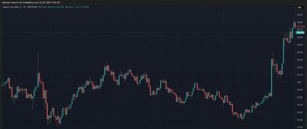 Dựa trên biểu đồ đã đăng, vốn hóa thị trường của Dogecoin (DOGE) hiện nay chỉ dưới $30 tỷ, với các dấu hiệu mạnh mẽ cho thấy sự gia tăng.