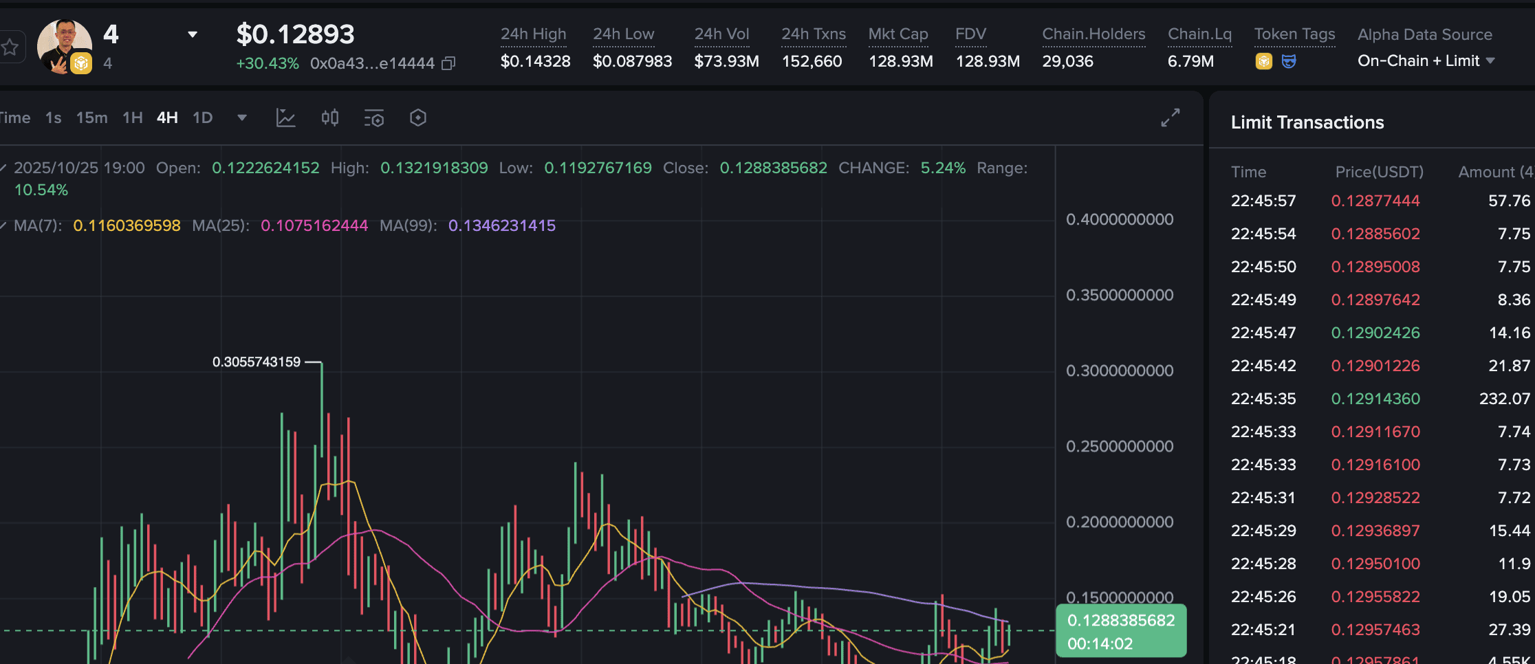 📊 $4 /USDT – 4小時圖分析 💰 進場區間: $0.12 – $0.13 🛡️ 支撐: $0.11 / $0.09 🎯 目標: 🥇 $0.15 – 第一阻力 ⚡ 🥈 $0.20 – 趨勢延續 🚀 🥉 $0.30 – 重大突破水平 🌕 ⚠️ 止損: 低於 $0.09 MA7 向上彎曲,MA25 平坦 — 早期趨勢反轉正在醞釀 📈 如果 $0.13 穩住,價格可能很快回升至 $0.15,翻轉 99MA ($0.134) 成爲支撐。結構暗示可能在潛在漲之前緩慢積累基礎。成交量開始增加,顯示買家再次醒來 🐂🔥 保持關注 — 超過 $0.15,動能可能迅速加速。