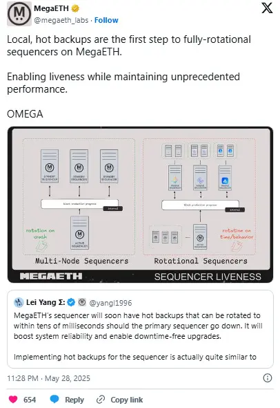 MegaETH 使用單個強大的定序器,而不是試圖去中心化區塊生產。區塊以約 10 毫秒 的速度生成,比主流 Rollup 快得多,並通過輪換定序器模型將安全性錨定回以太坊。
