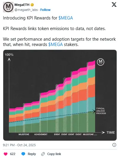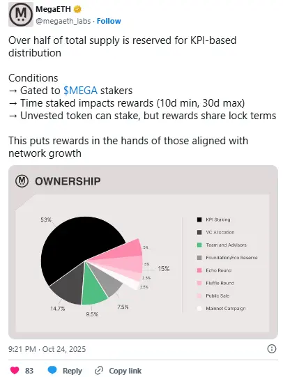 MegaETH 的生態系統保留了總供應量的 70.3% 用於長期激勵和生態系統發展,其中高達 53.3% 被指定用於基於績效的質押獎勵。提到的關鍵績效指標(KPI)包括:
