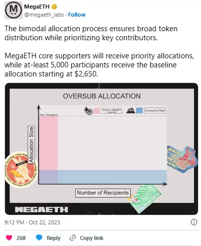 如果拍賣超額認購,MegaETH 將採用“U 形分配”來平衡深度和廣度。該系統優先向那些能夠證明對 MegaETH 或以太坊有實質性貢獻歷史(例如,長期鏈上活動或 NFT 所有權)的錢包分配更大的份額,同時確保至少 5,000 名參與者能獲得一個基本分配。