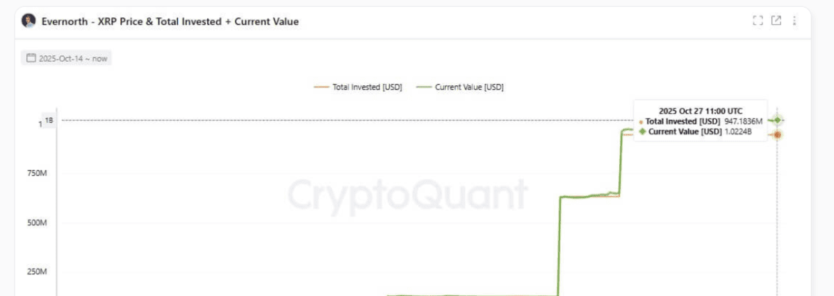根据区块链分析公司 CryptoQuant 于27日(当地时间)的报告,Evernorth 在过去一周内以约 $2.44 的平均价格购买了总计 3.887 亿 XRP。这代表了目标总额的 95%,并预计根据当前 XRP 价格已产生约 $75 百万的评估利润。